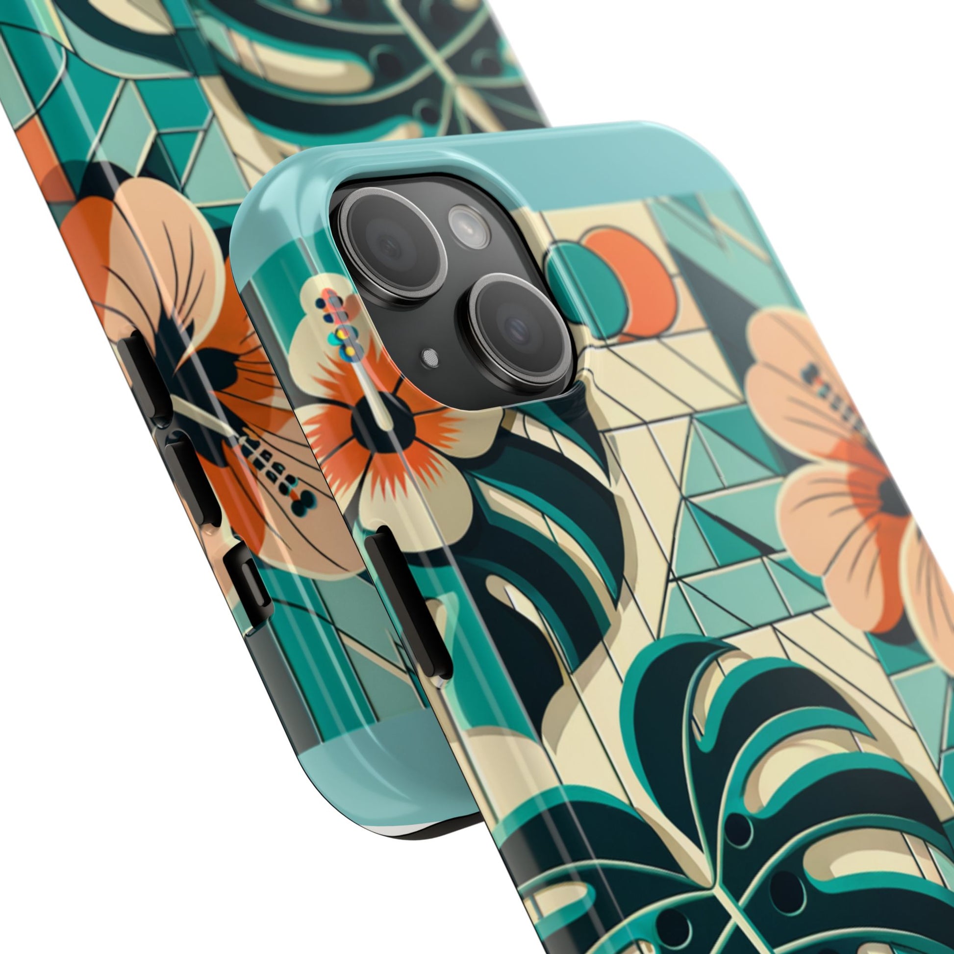 Bring a playful yet sophisticated vibe to your phone with our Monstera & Hibiscus Phone Case. Featuring a beautiful pattern of digitally illustrated monstera leaves and hibiscus flowers against an aqua backdrop, the case pays homage to the mid-century design, with its geometric shapes and primary colour blocks. A sharp vector rendering ensures the imagery pops with clarity. #PhoneCase #MidCenturyDesign #Monstera #Hibiscus #Aqua #BoldColors #VintageVibes #PhoneAccessory #TropicalPattern #RetroChic