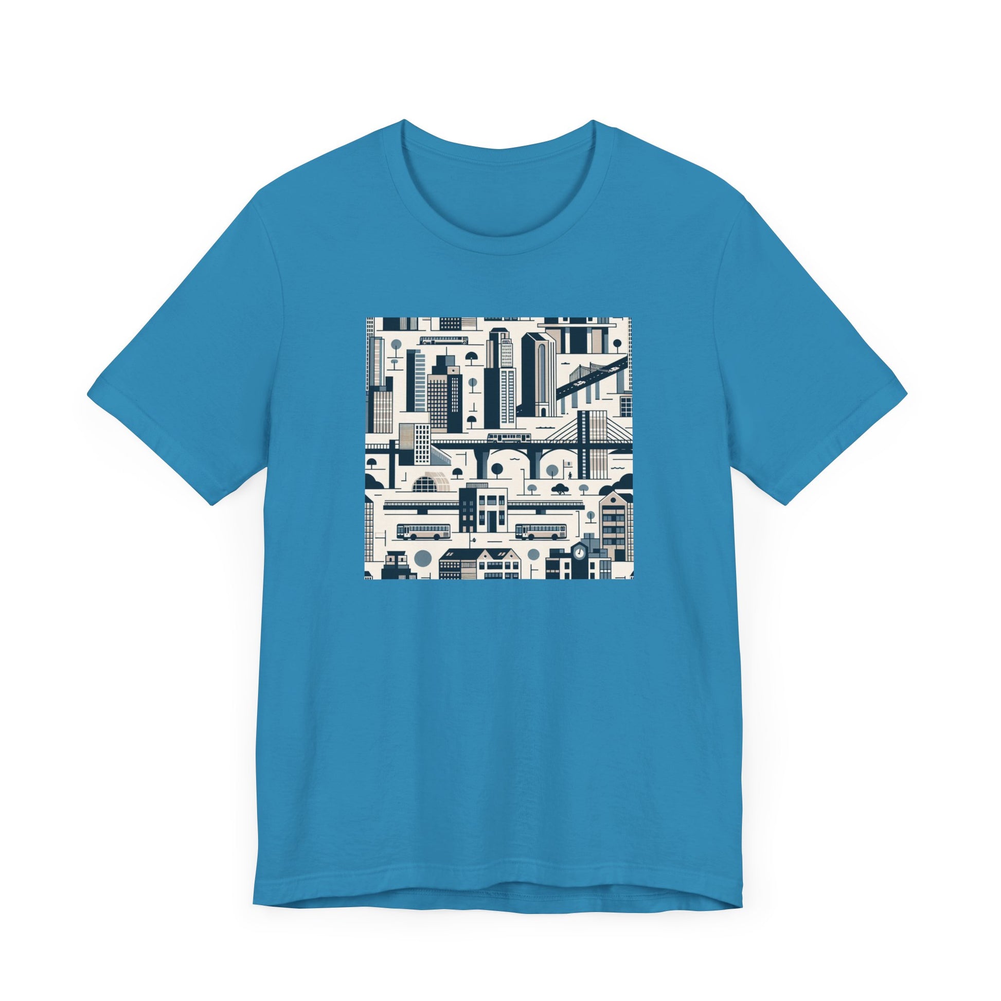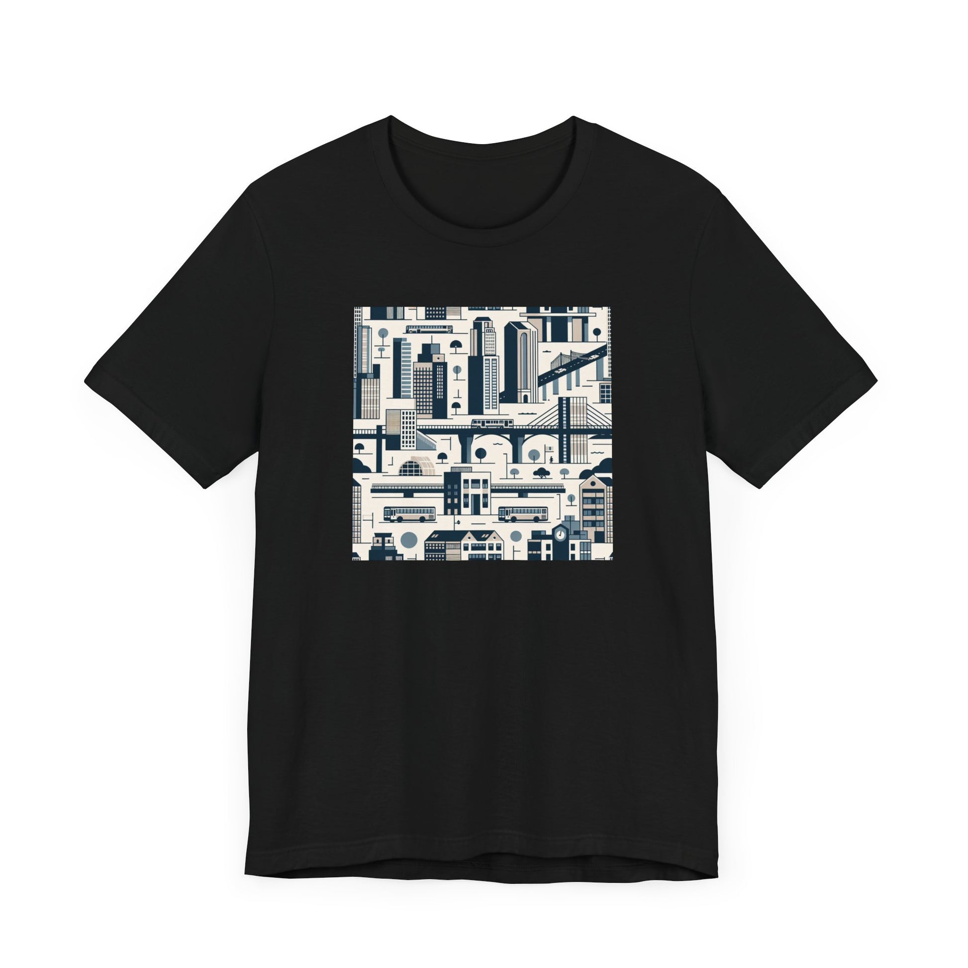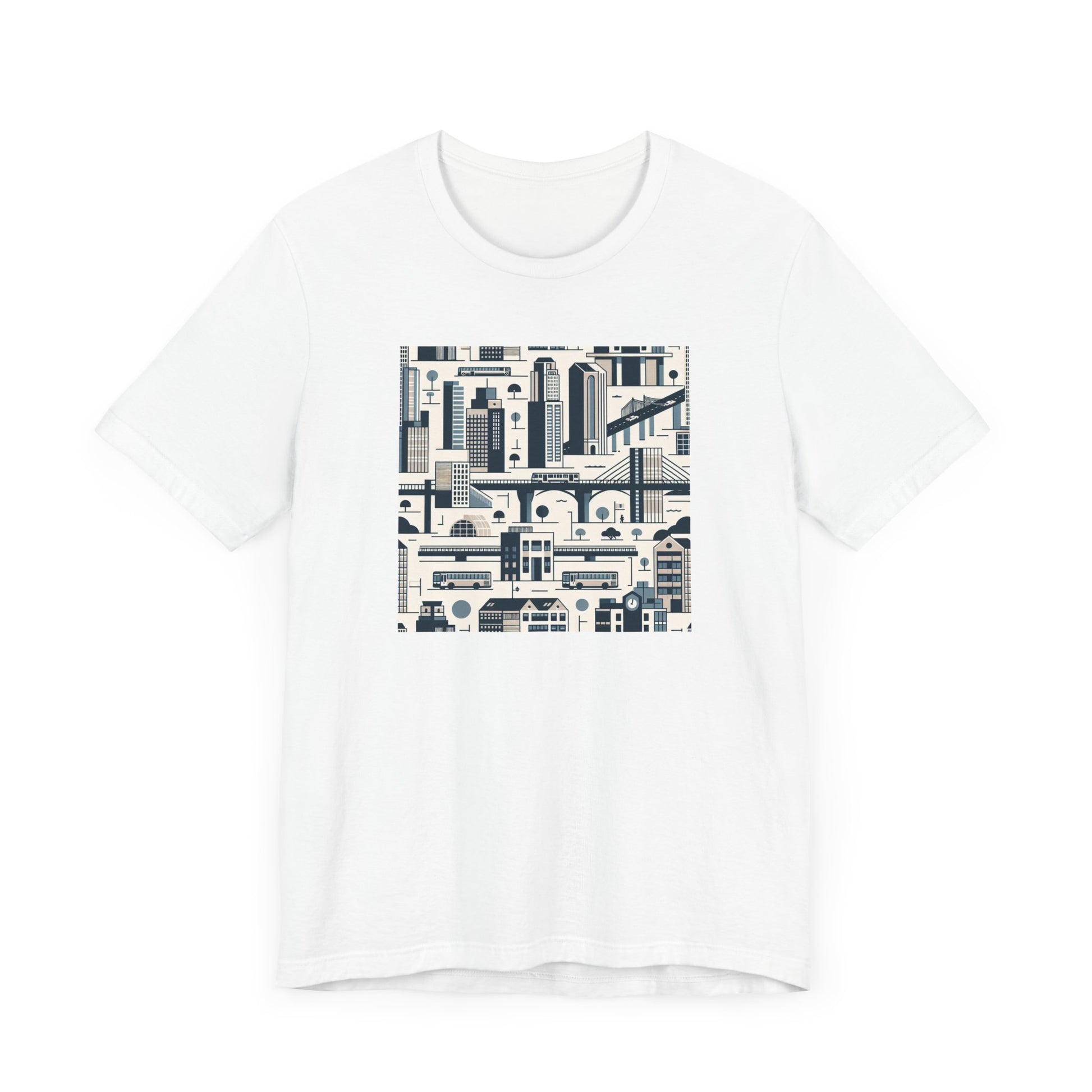 #UrbanTshirt #MinimalistFashion #CityscapeDesign #MonochromeStyle #GeometricShapes #Skyscrapers #UrbanLife #FashionStatement #BridgeDesign #PublicBuses #CityParks