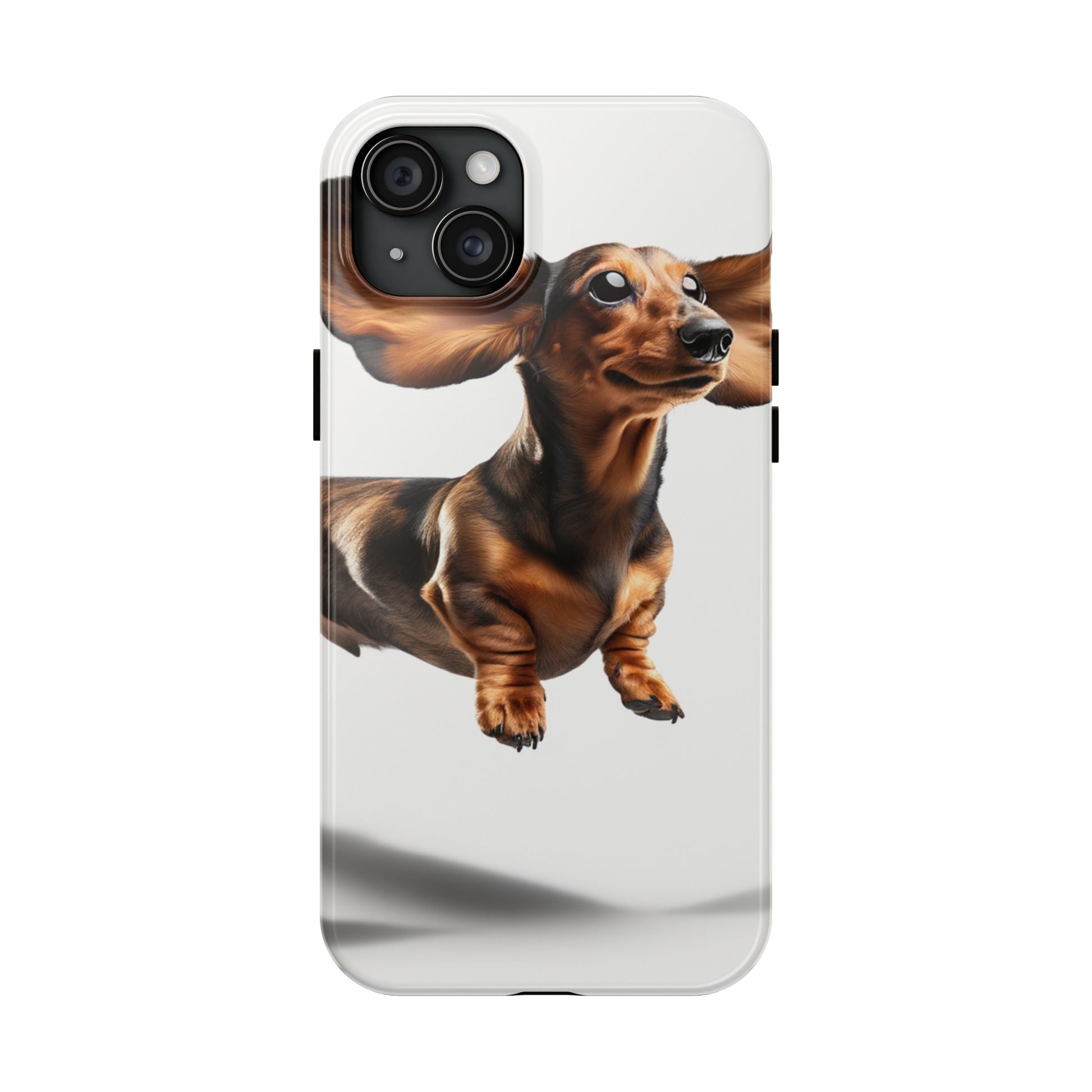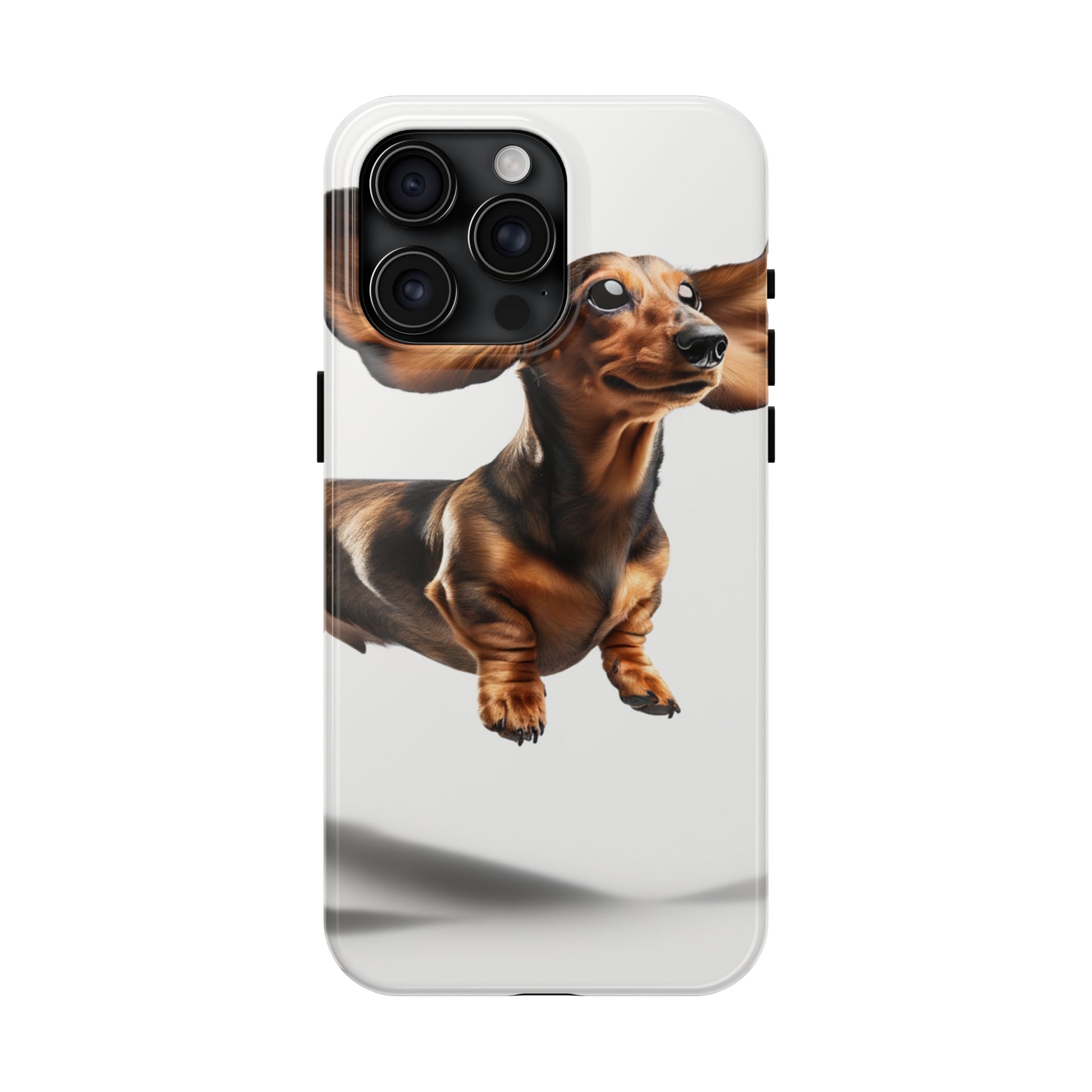 Discover our Dachshund Dog Phone Case. Marvel at the joyous flight of an airborne Dachshund, its ears flapping playfully against a stark white background. #DachshundLove #DogLovers #PhoneCase #UniqueDesign #Joyful #Playful #Canine #DogCase #MustHave #iPhoneCase #GiftForDogLovers #SmartphoneAccessories