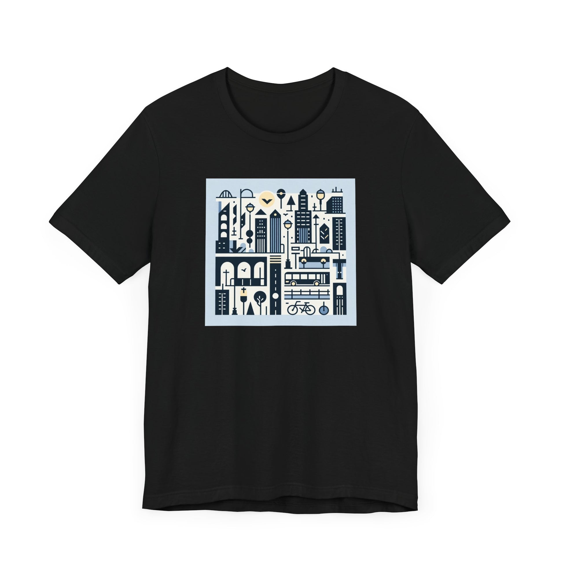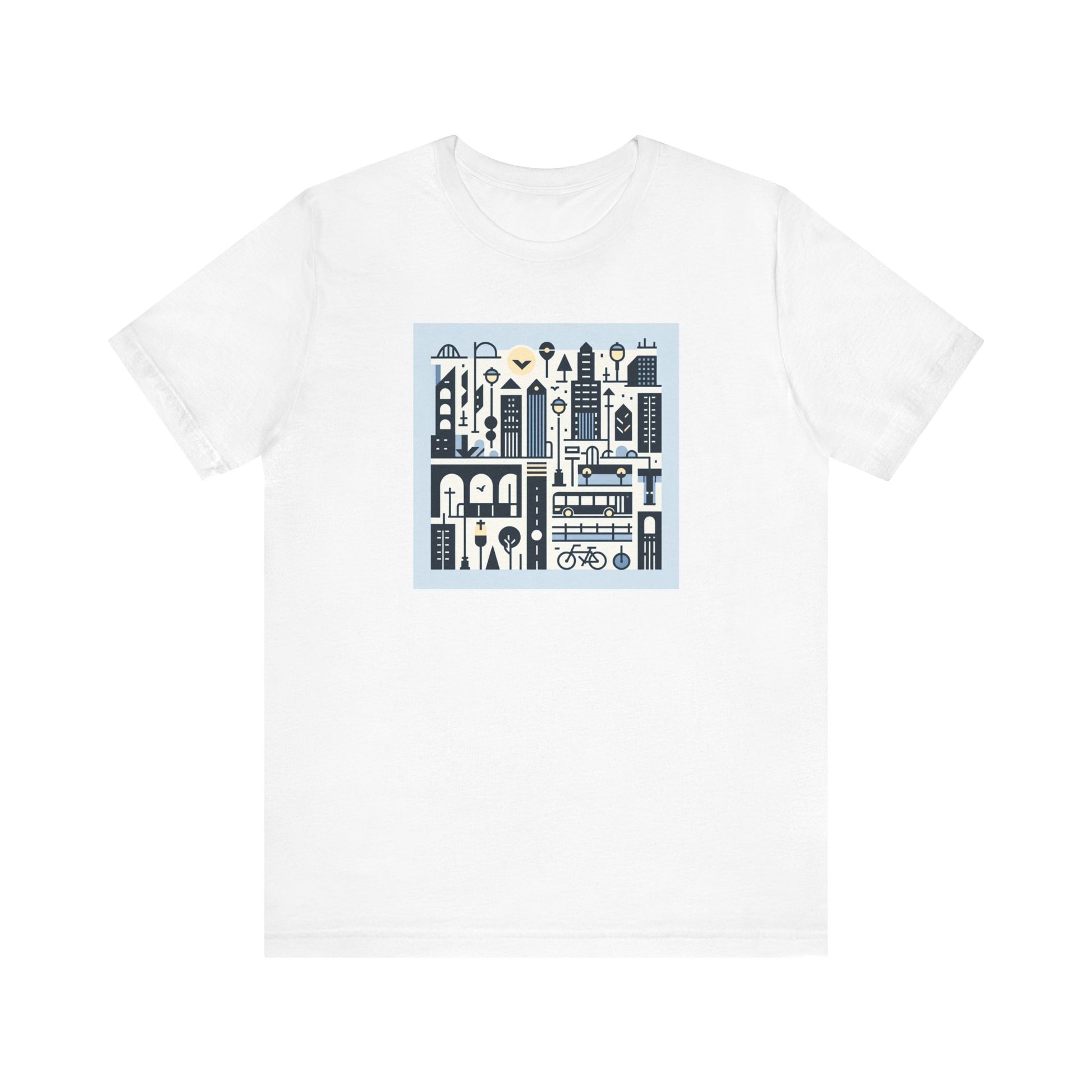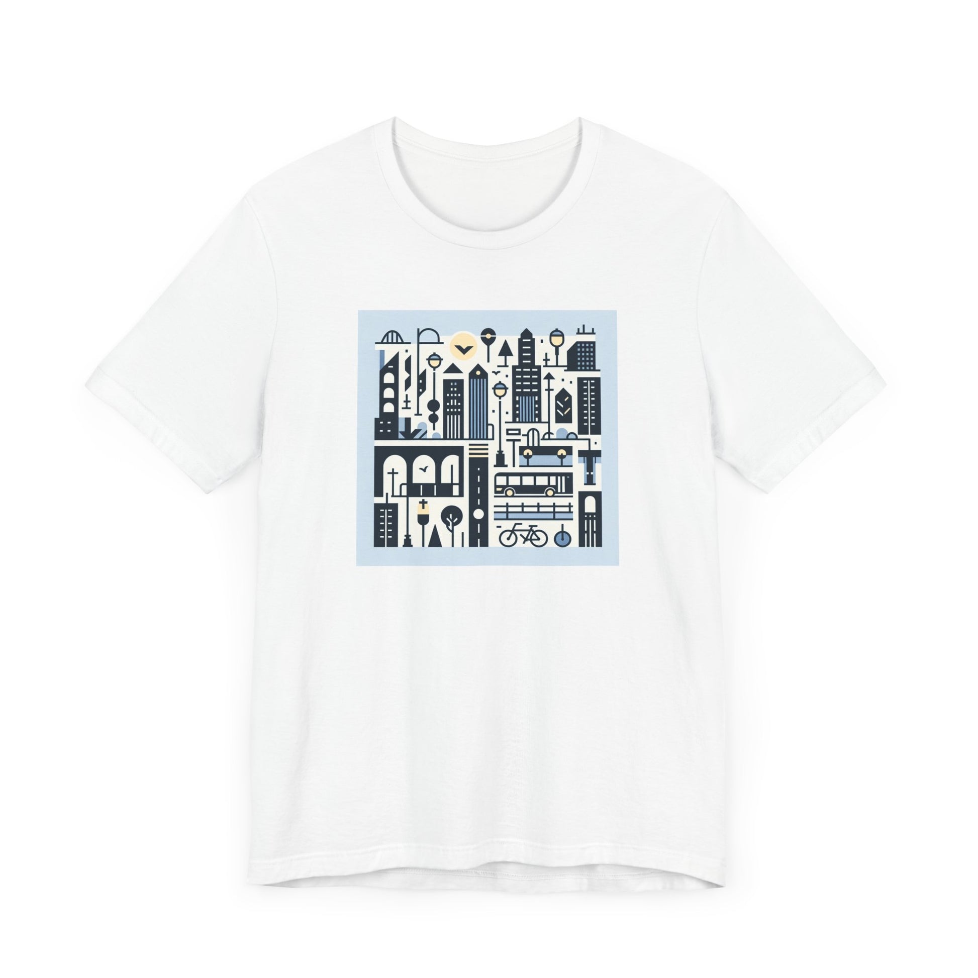 Experience the urban rhythm with this minimalist city-themed T-shirt. Its seamless design, imbued with stylized elements of a bustling metropolis - skyscrapers, city parks, streets, public buses, bicycles, bridges, city lights - captures the vibrancy of city life while radiating effortlessness. Immerse yourself in the energy and simplicity of everyday city living.