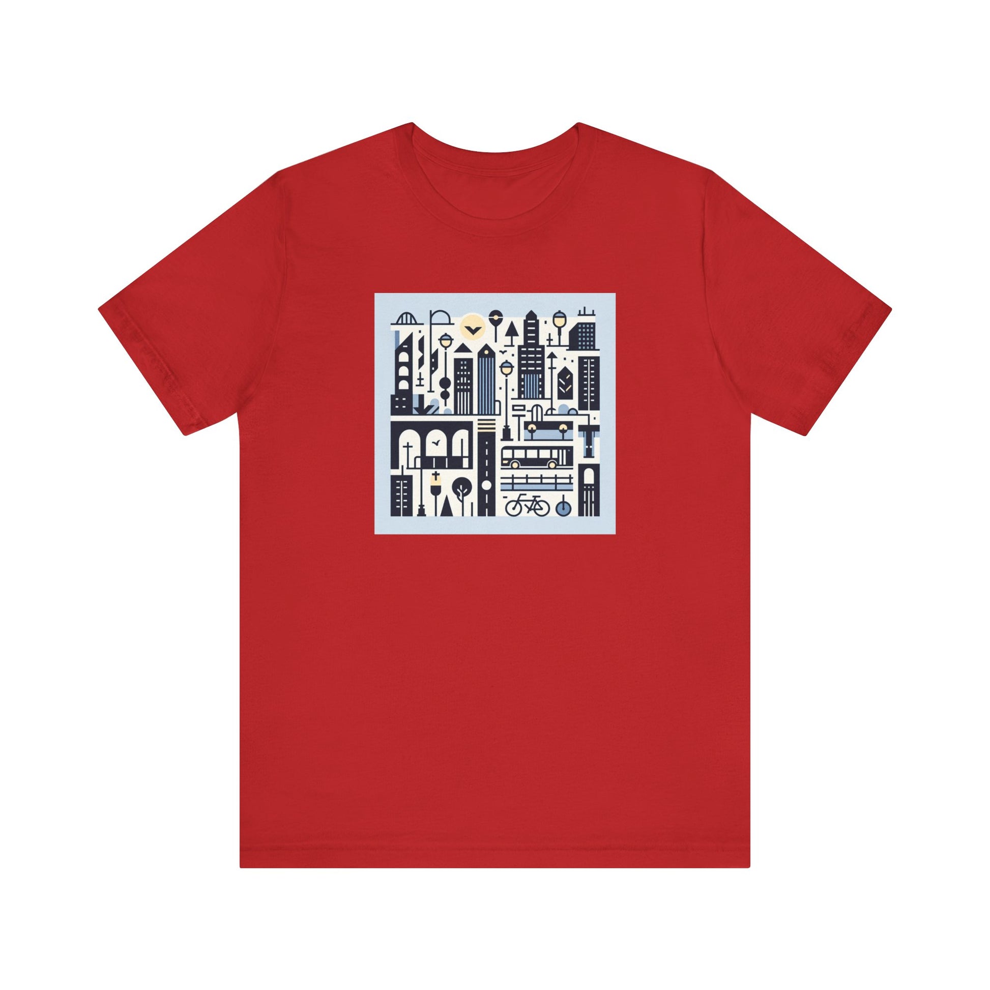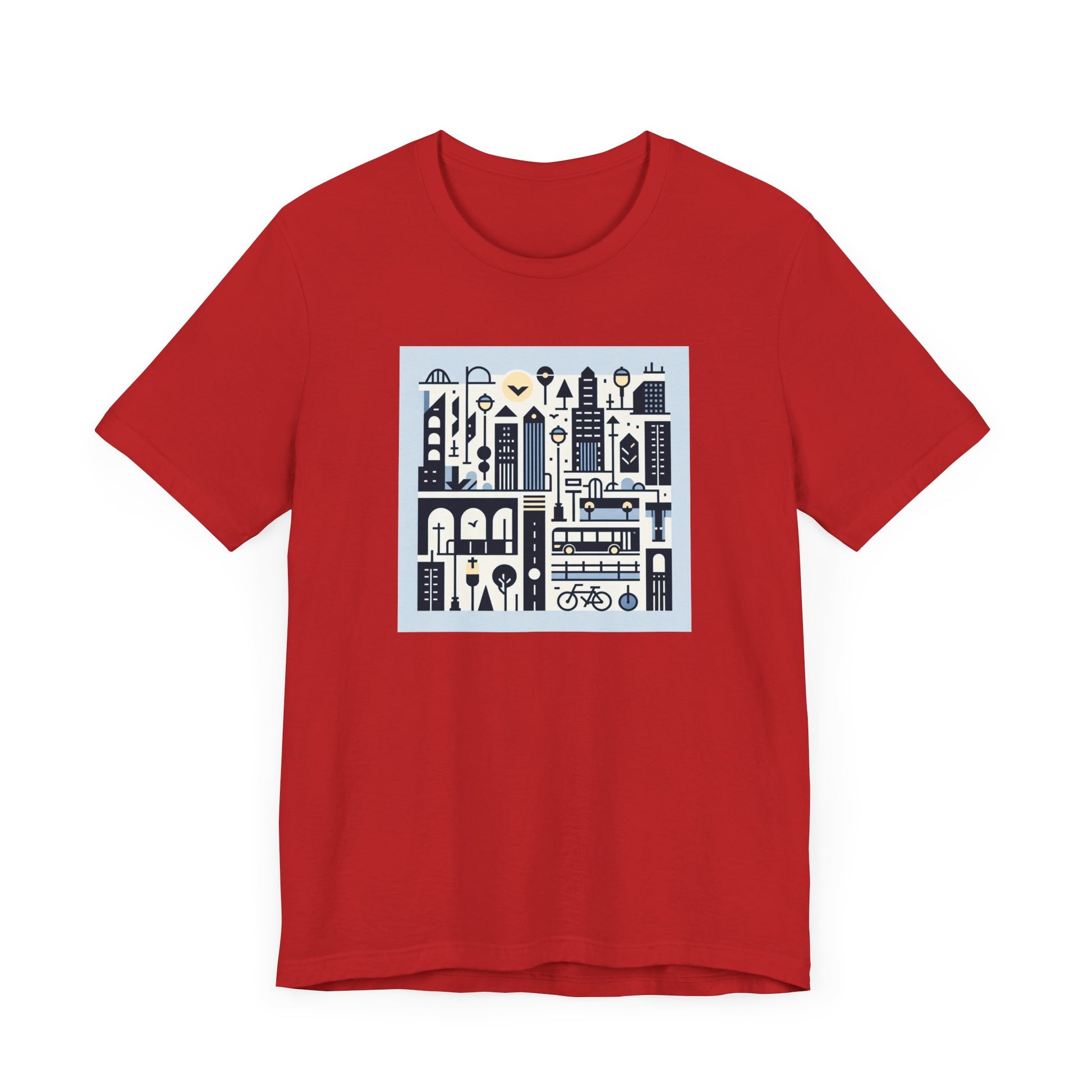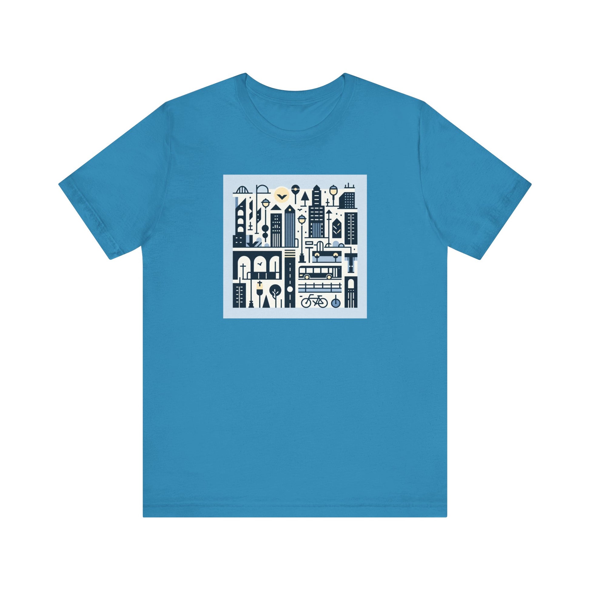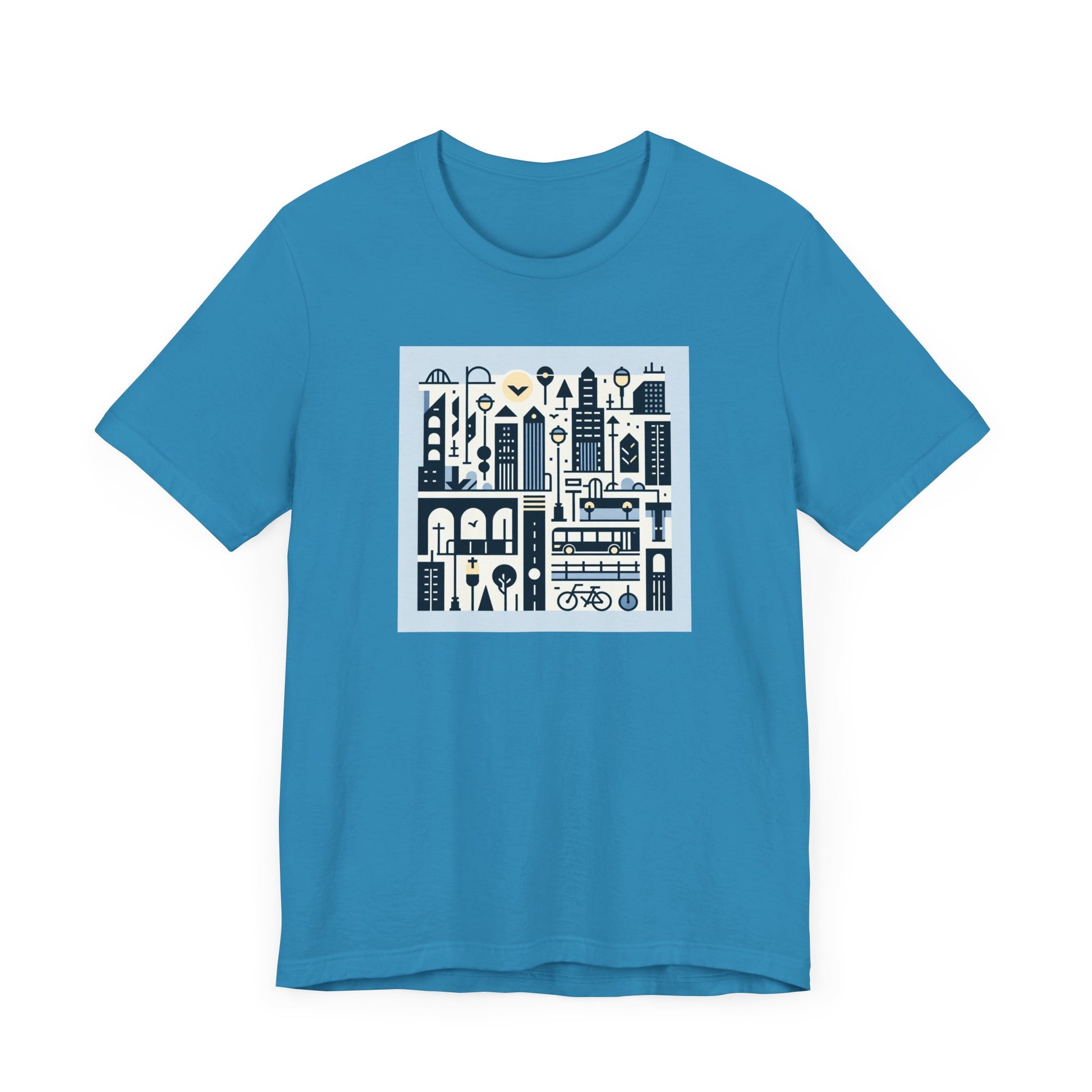 Experience the urban rhythm with this minimalist city-themed T-shirt. Its seamless design, imbued with stylized elements of a bustling metropolis - skyscrapers, city parks, streets, public buses, bicycles, bridges, city lights - captures the vibrancy of city life while radiating effortlessness. Immerse yourself in the energy and simplicity of everyday city living.