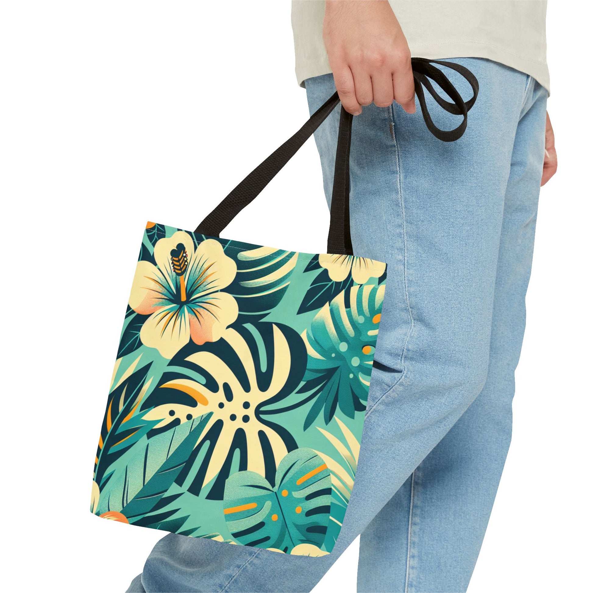 Unleash your inner vintage vixen with our Tropical Monstera and Hibiscus Tote Bag. Boasting digitally-rendered illustrations of lush monstera leaves and vibrant hibiscus flowers atop an aqua backdrop, this tote bag oozes midcentury modern charm. The playful mix of color blocks and textured shapes adds a dash of whimsy, making this perfect for your tropical getaway or city escape.