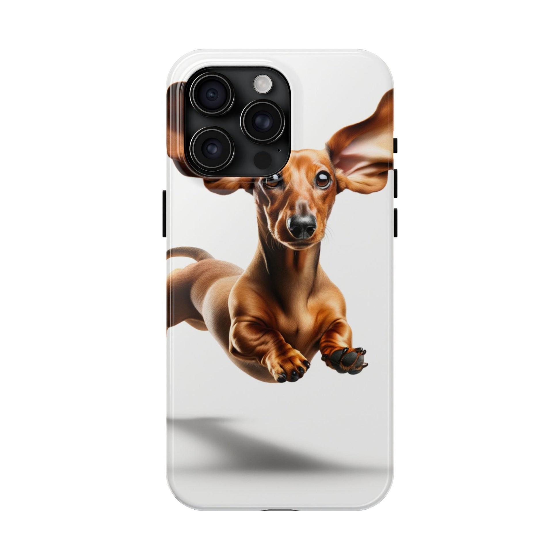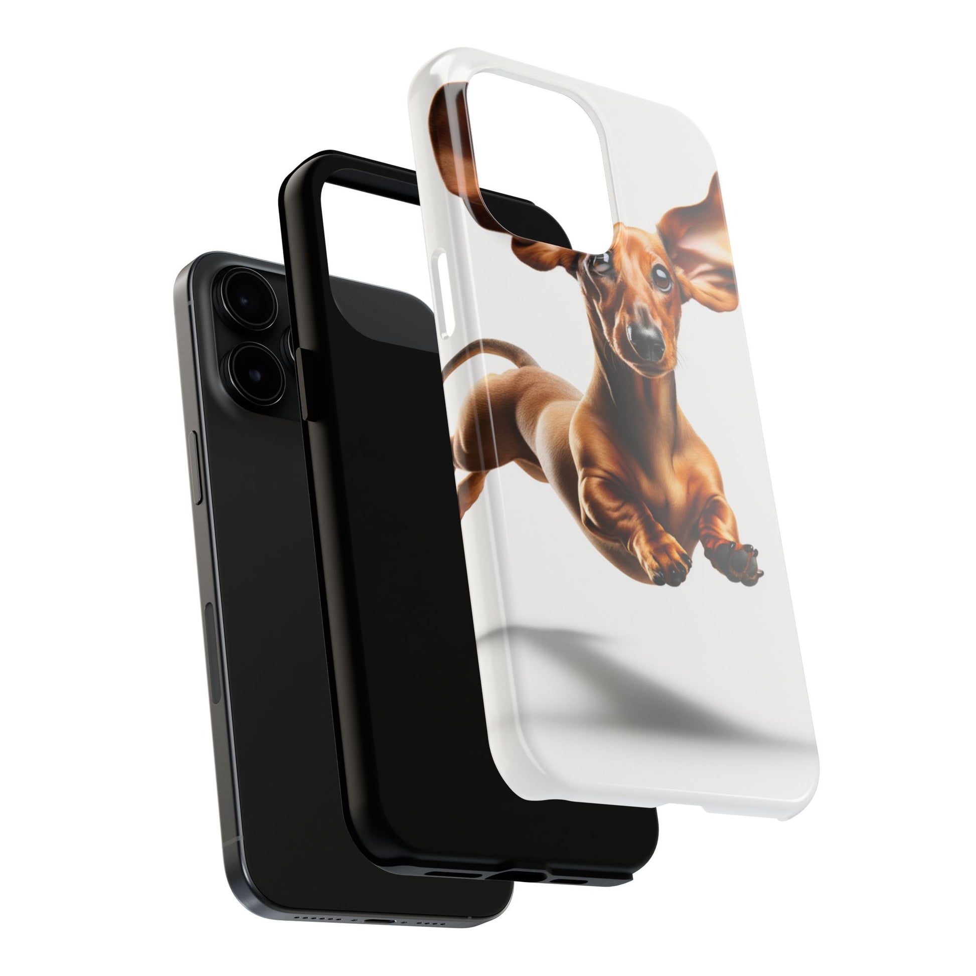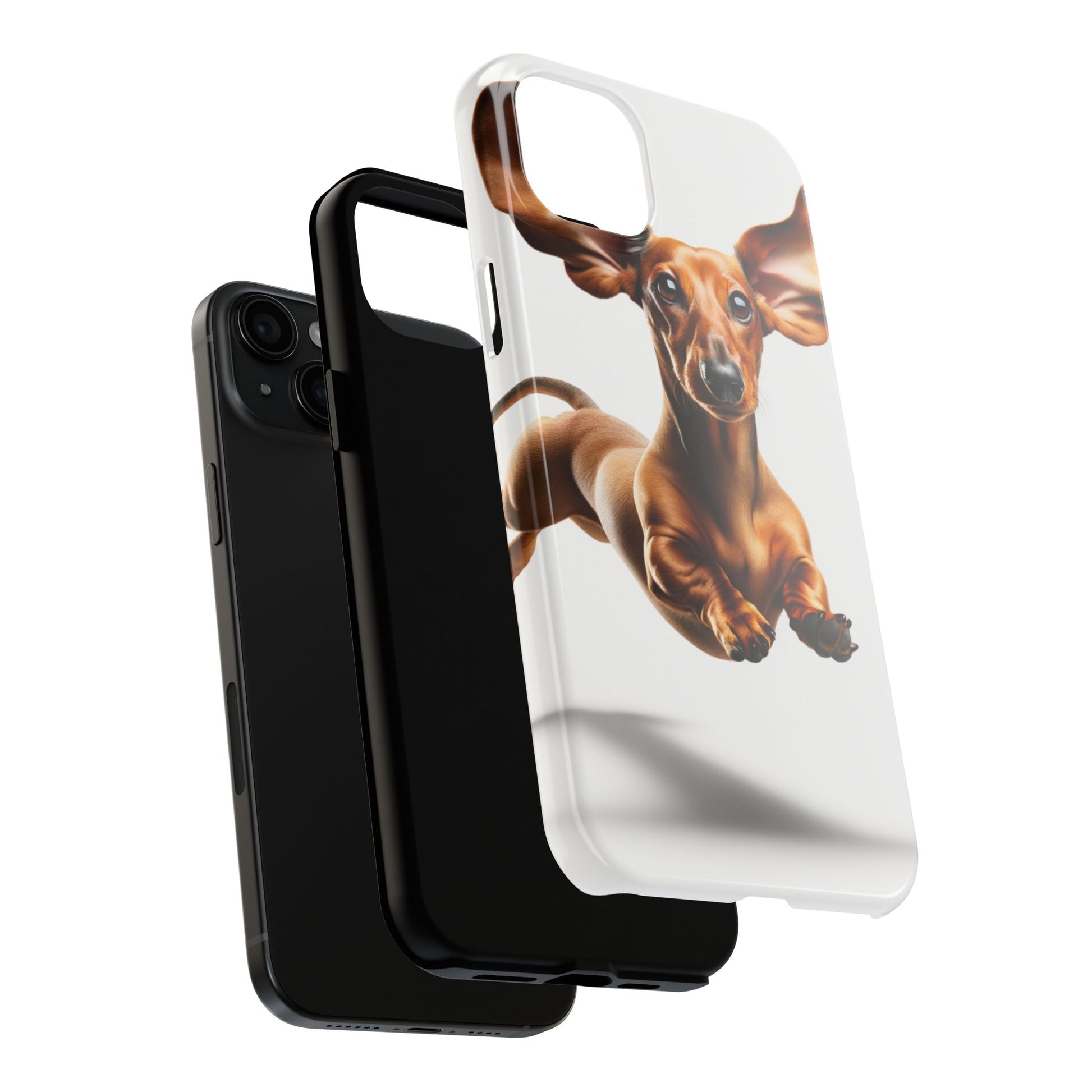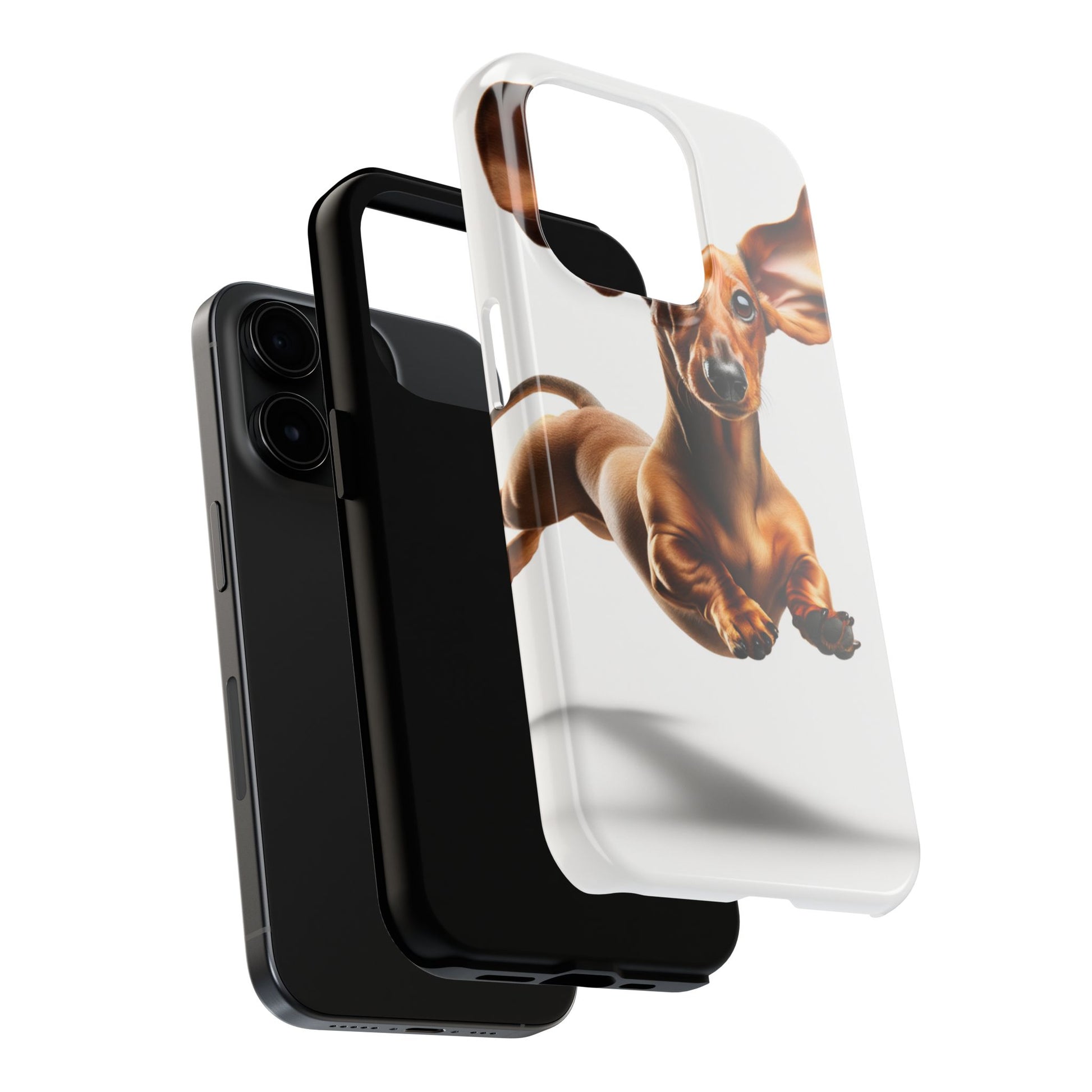 Presenting our delightful Dachshund Dog Phone Case! Watch as a fun dachshund leaps, its long ears flapping in the wind, giving a playful illusion of flight on a pure white backdrop. Wide-eyed excitement and a stretched-out, long body amplify the charm of the quirky breed. A sure delight for dachshund lovers! #PhoneCase #DoxyLover #DogDesign #DachshundGift #CanineCase #PhoneAccessories #QuirkyDesign #DachshundInFlight #PetPower #JoyInTheJump
