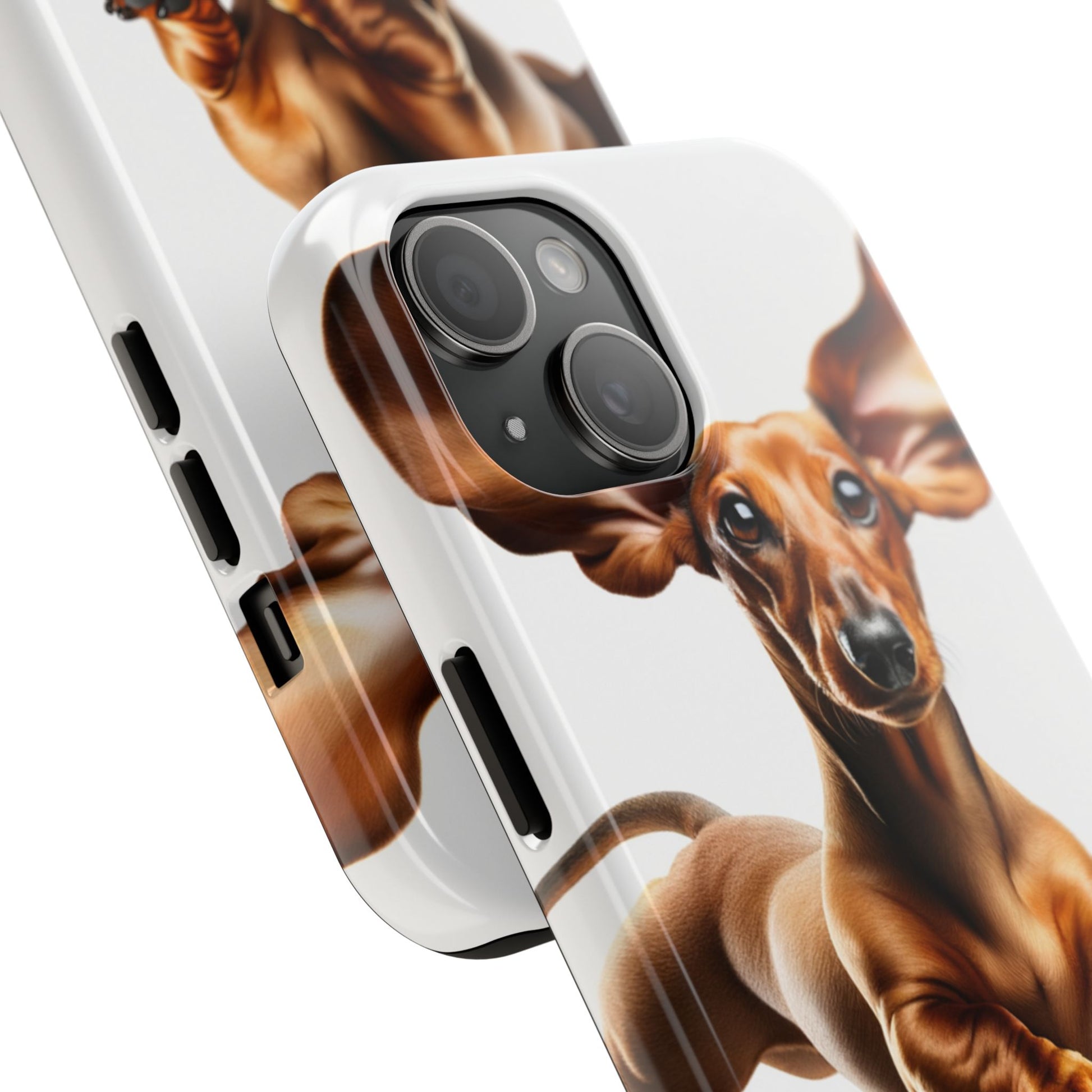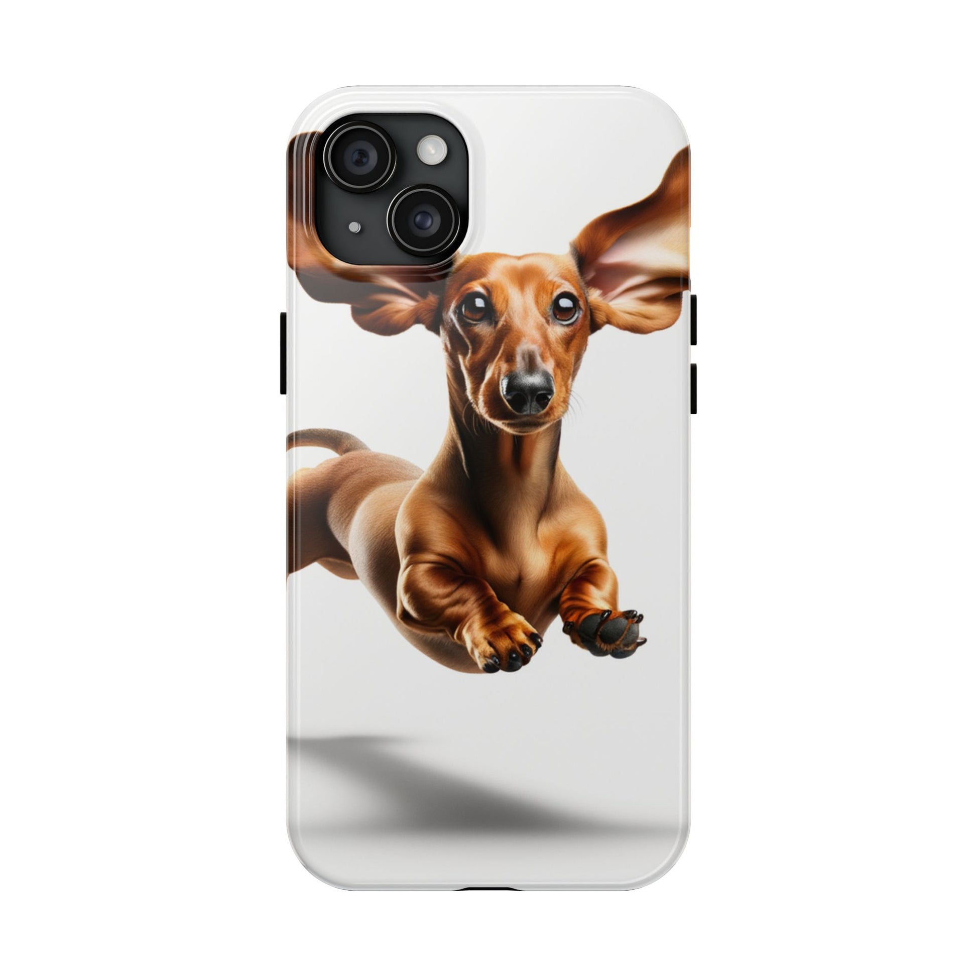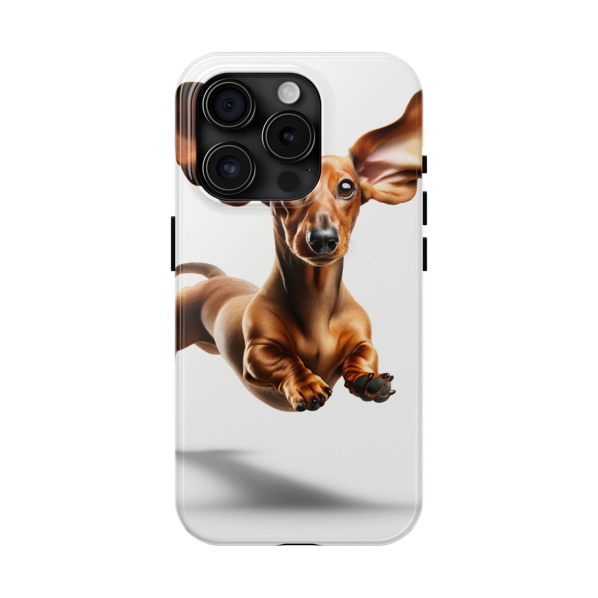 Presenting our delightful Dachshund Dog Phone Case! Watch as a fun dachshund leaps, its long ears flapping in the wind, giving a playful illusion of flight on a pure white backdrop. Wide-eyed excitement and a stretched-out, long body amplify the charm of the quirky breed. A sure delight for dachshund lovers! #PhoneCase #DoxyLover #DogDesign #DachshundGift #CanineCase #PhoneAccessories #QuirkyDesign #DachshundInFlight #PetPower #JoyInTheJump